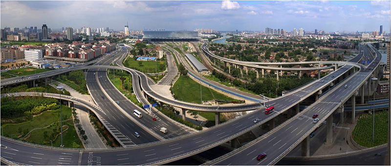 天津西站交通樞紐西縱聯絡線立交橋 坐落于紅橋區,總面積約25.6萬平米,為大型過鐵路互通式立交,橋梁面積約6.3萬平米,為我公司承攬的最長的高標準橋梁工程。